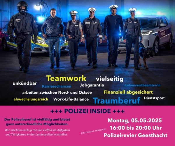 Geesthacht (pm). Am Montag, 5. Mai 2025 findet beim Polizeirevier Geesthacht die Veranstaltung „Polizei Inside“ statt. Ziel ist es, Interessierten einen Einblick in den Polizeiberuf zu geben und Fragen rund um Ausbildung und Karriere bei der Polizei zu beantworten.