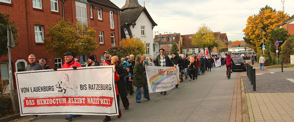 Eigentlich hätte die diesjährige „Wir sind nicht still!“-Demonstration in Wentorf bei Hamburg stattfinden sollen. Aus organisatorischen Gründen konnte die Veranstaltung dort jedoch nicht umgesetzt werden. Kurzfristig sprang Marc-André Bornkessel vom Bündnis „Das Herzogtum bleibt Nazifrei“ ein. Nach Rücksprache mit Möllns Bürgermeister Ingo Schäper übernahm er die Organisation und meldete die Demonstration in Mölln an. „Ein Teil der Demokratie ist ja auch das Demonstrationsrecht, das muss man ja auch so sagen. Wir waren zwar anfangs etwas irritiert, sage ich mal vorsichtig, weil wir nicht damit gerechnet hatten, dass es hier in Mölln stattfindet, aber ich glaube, wir haben jetzt eine ganz gute Lösung gefunden. Demonstrationen sind wichtig und bei so vielen Menschen, die wir heute hier haben, ist es auch gut“, erklärte Bürgermeister Schäper, warum Mölln sich trotz zeitgleich stattfindenden Herbstmarkts, trotzdem bereit erklärte, ein zweites Mal die Demo nach Mölln zu holen. Gleichzeitig bestätigte er die Aussagen des Bündnisses „Das Herzogtum bleibt Nazifrei“, dass aktuell die rechte Szene in der Eulenspiegelstadt zuletzt wieder aktiver ist: „Wir haben tatsächlich in den letzten Tagen mehrere Hakenkreuze gefunden, Schmierereien, auch hier beispielsweise in der Innenstadt und auf dem Schulberg. Wir bringen das immer zur Anzeige und entfernen es so schnell wie möglich. Aber tatsächlich ist es mehr geworden.“