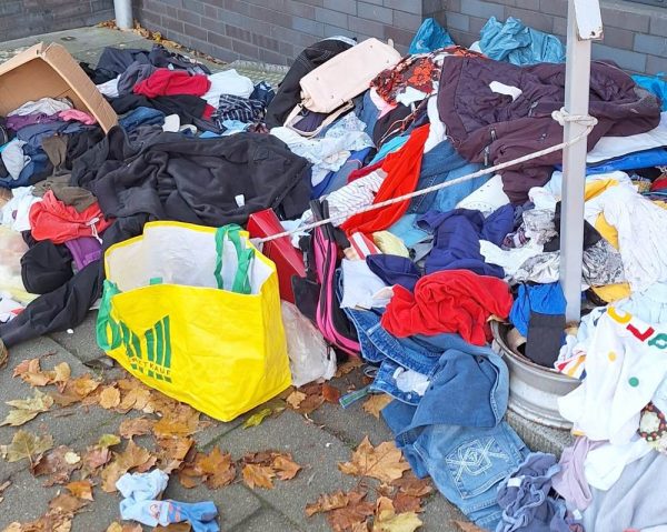 Vor dem Eingang des AWO Kaufhauses in Geesthacht türmen sich unbrauchbaren Kleidung und Haushaltsgegenstände. Foto: hfr