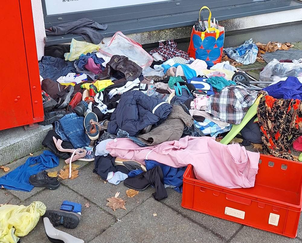 Geesthacht (pm).  Am frühen Montagmorgen, 3. November 2025, wurde vor dem AWO-Kaufhaus in Geesthacht, Lauenburger Straße, eine große Menge entsorgten Mülls entdeckt. Der Müll enthielt unter anderen stark verschmutzte Aschenbecher, zahlreiche benutzte und teils abgebrochene Buntstifte, ein verschimmeltes Abtropfgestell für Geschirr diverses beschädigtes und verschmutztes Geschirr sowie teils verschlissene Kleidung.