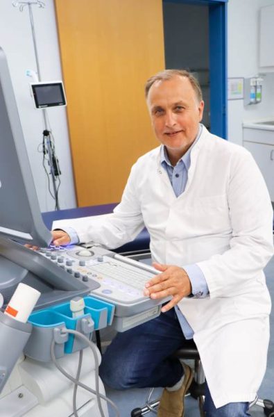 Dr. Christian Tiemer am Sonographie-Gerät (Ultraschall). Foto: AMEOS, hfr