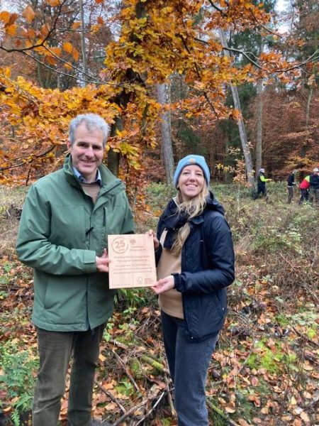 Miriam Arndt vom FSC überreicht Marcus Deinert, Fachdienstleiter der Kreisforsten, eine Plakette als Anerkennung. Foto: hfr