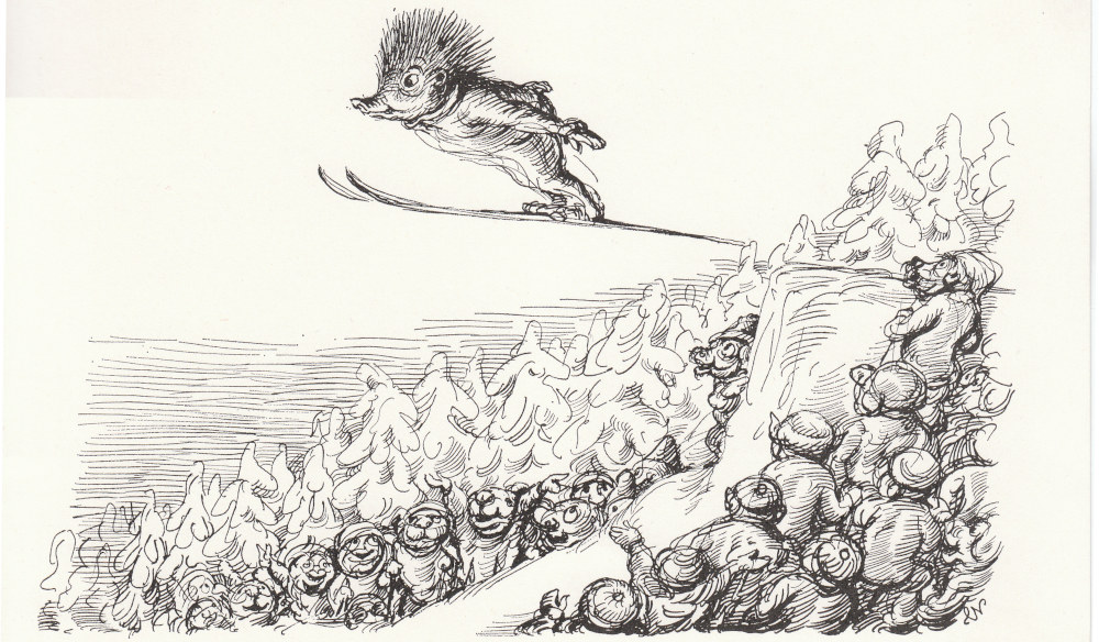 Der Igel, der mit Schwung und jeder Menge Mut auf seinen Skiern von der Schanze springt, verkörpert Optimismus und einen zuversichtlichen Blick nach vorne.