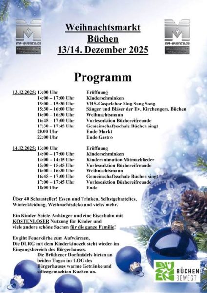 Büchen (pm). Der Weihnachtsmarkt auf dem Bürgerplatz und im Bürgerhaus findet am Sonnabend, 13. Dezember von 13 Uhr bis 20 Uhr (Markt) beziehungsweise 22 Uhr (Ende Gastronomie) und am Sonntag, 14. Dezember von 13 Uhr bis 18 Uhr mit über 40 Ausstellern statt. Für die Kinder gibt es unter anderen wieder einen Anhänger mit Spielen und eine Eisenbahn, die kostenlos genutzt werden kann.