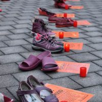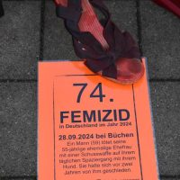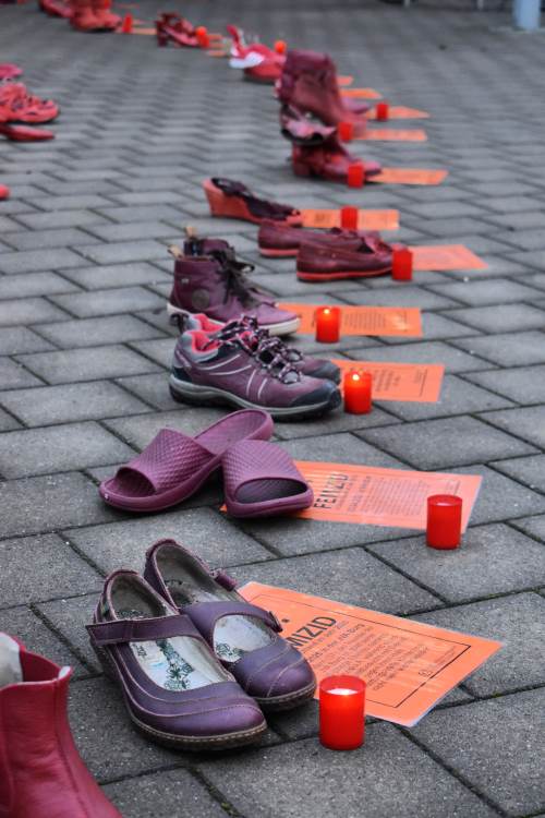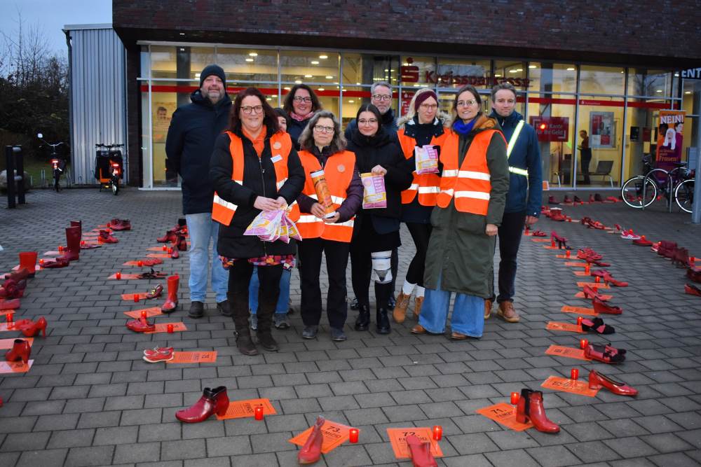 Orange Tafeln mit den Namen der Getöteten und knappen Informationen zu den Tathergängen wurden flankiert von roten Schuhen und Trauerkerzen. Der Einbruch der Dunkelheit machten diese Aktion umso wirkungsvoller und berührte viele Menschen auf der viel befahrenen Kreuzung auch aus der Ferne. „Wir sind bewegt und – zugegeben – auch erschöpft von all den Gesprächen über seelische und körperliche Gewalt. Aber es bekräftigt uns darin, wie wichtig es ist, das Schweigen zu brechen!“, betonten die Organisatorinnen.