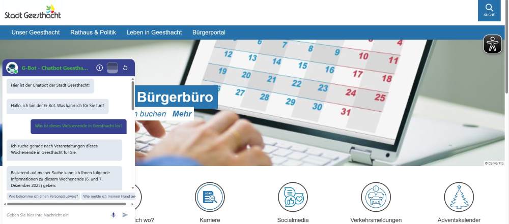 Interessierte finden den KI-gestützten Chatbot auf der Website der Stadt Geesthacht (www.geesthacht.de). Auf deren Startseite grüßt er zu jeder Uhrzeit und bietet über ein sich öffnendes Dialogfenster seine Unterstützung an: „Hallo, ich bin der G-Bot. Was kann ich für Sie tun?“