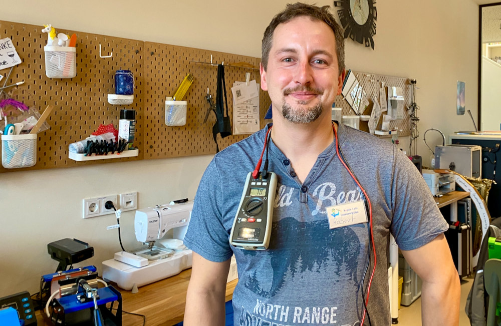 Da ist Robert Grunert, 37 Jahre, Elektroniker für Energie und Gebäudetechnik. Von Anfang an hat er die Idee des Repair-Cafés unterstützt. Sein Schwerpunkt: Geräte, die einen elektrischen Anschluss haben. Geduld ist ihm wichtig, um Lösungen zu finden, und die Freude an der Zusammenarbeit mit einem familiären und freundlichen Team. Denn manchmal findet man die Lösung für ein Problem erst gemeinsam. Er möchte mit den Menschen ins Gespräch kommen und aufklären. Nachhaltigkeit ist ein Ziel seines Engagements. Und er sagt: „Falls das Gerät nicht reparabel ist, will ich den Menschen ein gutes Gefühl vermitteln, damit sie das Repair-Café mit einem Lächeln verlassen.“