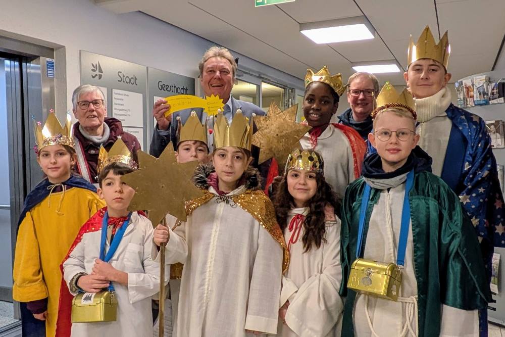 „Vielen Dank für euren Besuch bei uns und dafür, dass ihr euch für Kinderrechte einsetzt. Das ist ein sehr wichtiges Thema, gerade in den heutigen unruhigen Zeiten“, betonte Geesthachts Bürgermeister Olaf Schulze. Im Namen des Rathauses füllte er zusammen mit weiteren Verwaltungsmitarbeitenden die Spendendosen der Sternsinger. Als Dankeschön überreichten ihm die Kinder eine gebastelte Sternschnuppe aus Tonpapier mit dem Segensspruch „20*C+M+B+26“ für das Jahr 2026.