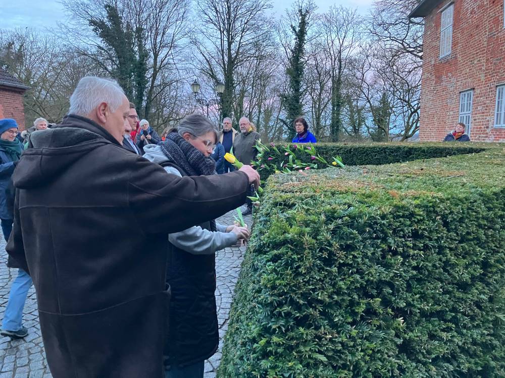 • Um 17 Uhr versammeln sich die Teilnehmenden am Gedenkstein. Dort werden Menschen aus Politik, Verwaltung und Zivilgesellschaft zu Wort kommen. Die würdevolle Atmosphäre am Gedenkstein lädt zum persönlichen Innehalten ein.