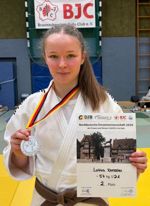 Für die 16-jährige Lotta Dressler brachten die norddeutschen Meisterschaften Frust und Freude zugleich. Wurde sie am Samstag bei ihrem letzten U18-Auftritt nach zwei schnellen Siegen im Halbfinale aus medizinischen Gründen umstritten aus dem Wettkampf genommen und so um eine klar vorhandene Chance eines Nordtitels gebracht, setzte sie den Frust des Vortages am tags darauf durchgeführten U21-Turnier in Power um. Als Doppelstarterin nutzte sie ihr Debüt in der höheren Altersklasse zu drei überzeugenden Siegen mit klaren Punktwürfen, denen sich auch ihre Dauerrivalin aus Eutin, die tags zuvor den U18-Titel holte, diesmal beugen musste. So war die Freude über die Silbermedaille auf norddeutscher Ebene besonders groß. Braungurt Lotta, die auch schon in das Anfängertraining beim To-Judo-Kan Ratzeburg eingebunden ist, fiebert nun der Deutschen Meisterschaft am 7. März in Potsdam entgegen.