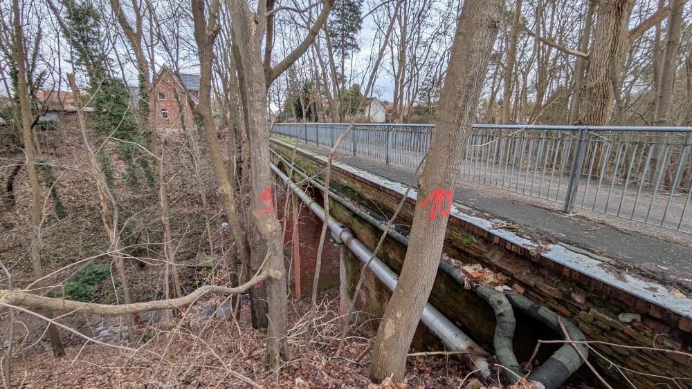 Die Fällarbeiten sind ein notwendiger erster Schritt, um Platz für die Baustelleneinrichtung, Gerüste und die benötigten Maschinen zu schaffen. Nur durch diese Baufeldfreimachung kann die strukturelle Sicherheit und langfristige Erhaltung der historischen Dreifelderbogenbrücke gewährleistet werden.