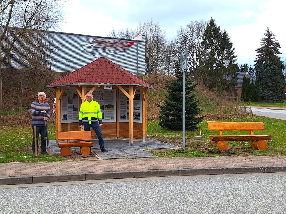 Der Pavillon war im Rahmen der letztjährigen 72-Stunden-Aktion von der Landjugend eigeninitiativ und ehrenamtlich gebaut worden und informiert auf Infoplatten über die Historie des Ortes. Die neuen Bänke bieten nun Rastmöglichkeiten für große und kleine Besucher an dieser zentralen Stelle, so auch für Fahrradtouristen auf ihrem Weg vom Kanalfahrradweg in den Ort.