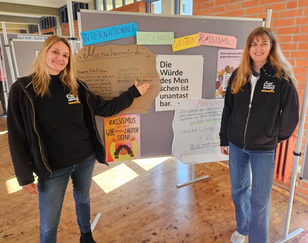 Die Respekt Coaches Sabrina Pyschholz (links) und Nian Hehn präsentieren die von SchülerInnen gestalteten Plakate. Foto: hfr