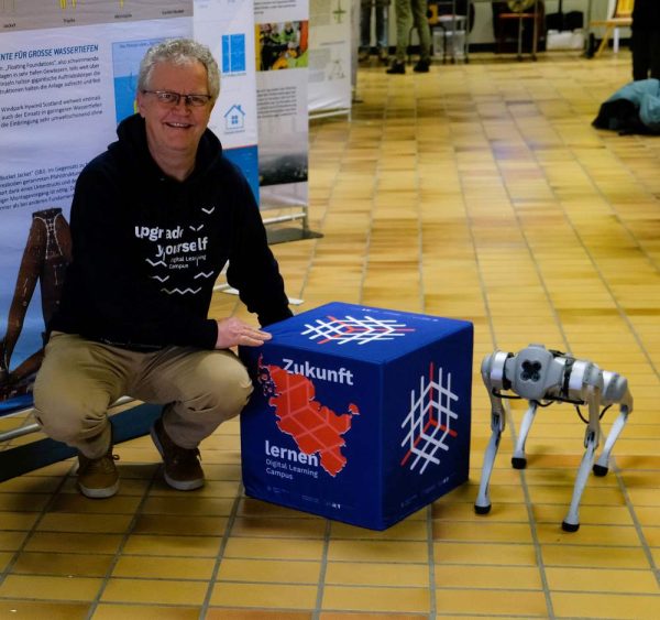 Staunen! Zwischendurch kam ein immer gern gesehener Gast vorbei: Roboterhund „Horst“ in Begleitung von Thomas Lange (Projektleitung Digital Learning Campus Lübeck). Immer wieder blieben Gäste stehen und es bildeten sich kleine Gruppen um die beiden. „Faszinierend, aber auch etwas erschreckend, wie echt die Bewegungen des Roboterhundes wirken“, hörte man es begeistert aus der Menge. Schnell stellte sich die Frage, was alles in dem Roboter steckt, der eigentlich an der Technischen Universität Lübeck zur Lehre von Robotik und Programmierung zum Einsatz kommt.