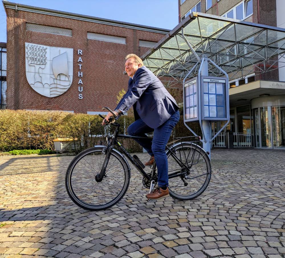 Geesthachts Bürgermeister Olaf Schulze mit seinem Fahrrad vor dem Geesthachter Rathaus. Foto: Stadt Geesthacht, hfr