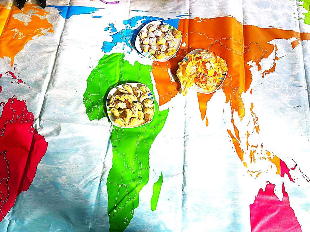 Gemeinsam wurden auf einer großen Weltkarte die Herkunftsländer der Gebäcke gesucht. Mit der Erfahrung, dass „die Welt gut schmeckt“ und „es viel Schönes und Positives zu entdecken gibt“, verließen die Kinder an diesem Tag ihre Schule.