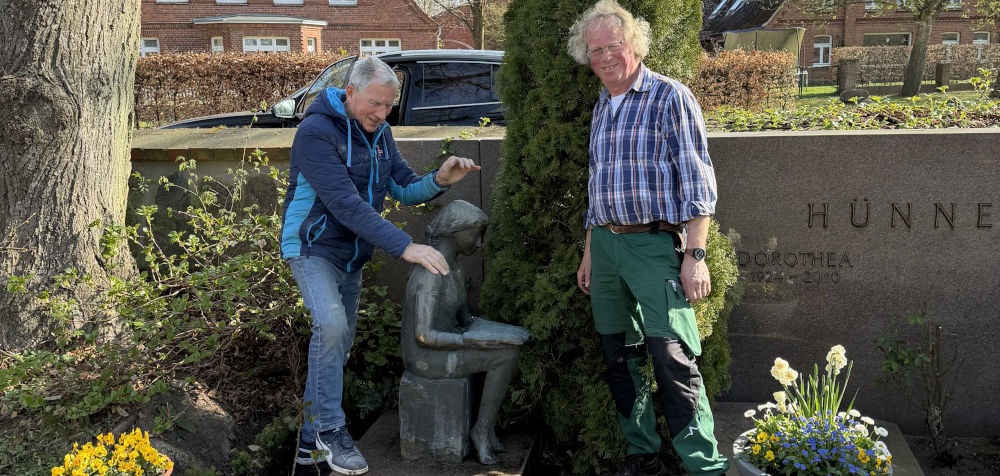 Schmilau (aa/pm). Nach monatelanger Abwesenheit ist die Skulptur Die Lesende des Bildhauers Karl-Heinz Goedke wieder an ihrem angestammten Ort: dem Friedhof in Schmilau. Meinhard Füllner, unterstützt vom Friedhofsgärtner Wijnand Brakhoven, montierte die Bronzefigur diebstahlsicher auf der Grabanlage – ein Akt der Wiederherstellung nach einem traurigen Kapitel.